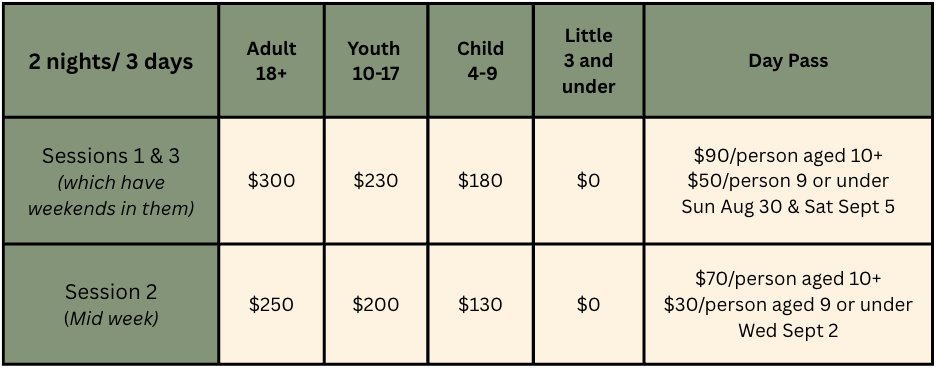 2026 Dates & Pricing 2026 Dates & Pricing 2026 Dates & Pricing DATESAUGUST 29 - 31SEPTEMBER 1 - 3SEPTEMBER 4 - 6Book 2 back-to-back sessions of family camp and the night in between is no additional cost!